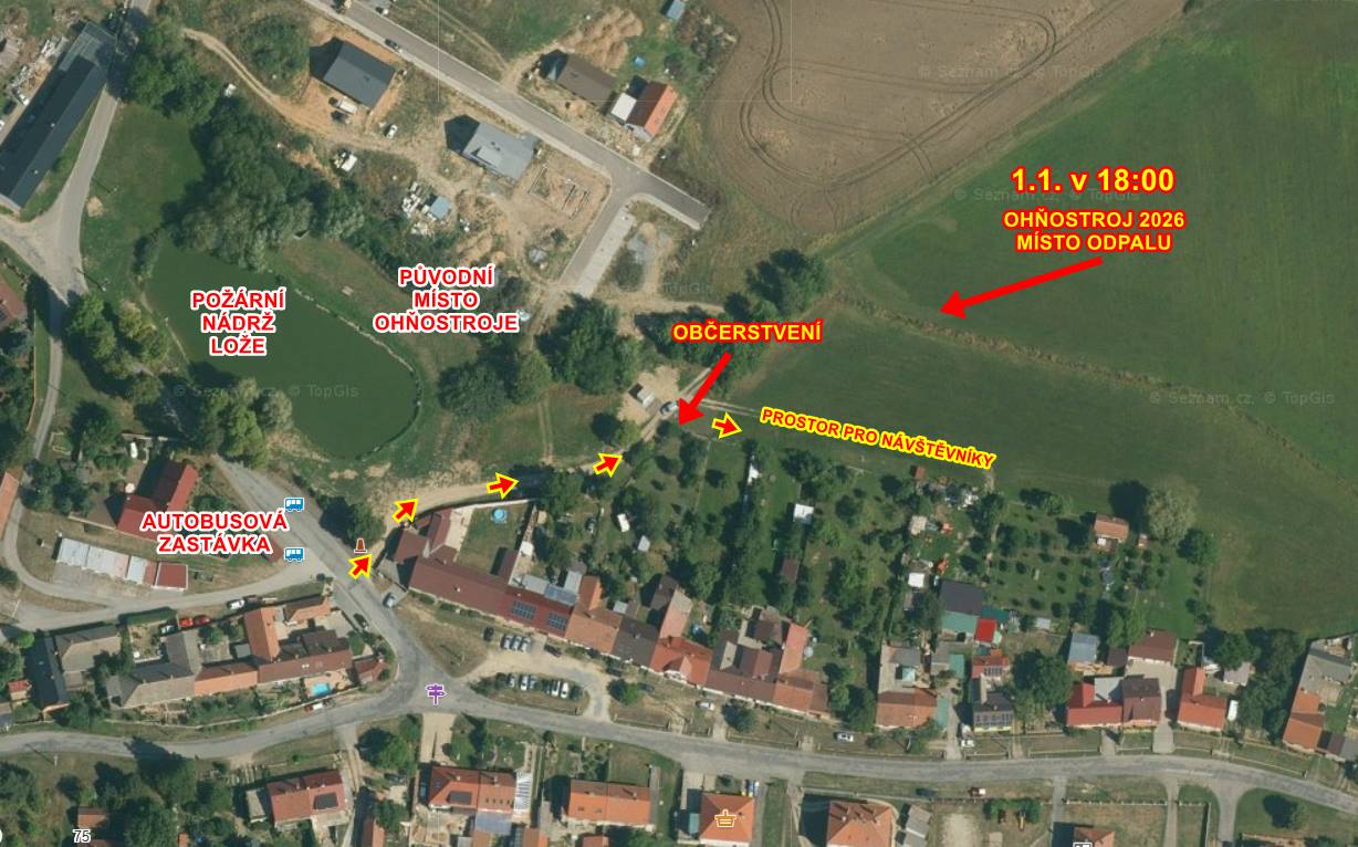 1.1.2026 Z organizačních a bezpečnostních důvodů došlo ke změně lokality konání ohňostroje o kousek na východ ???? Místo "odpalu" je na louce pod zahradama - východně od požární nádrže Lože. viz. mapa