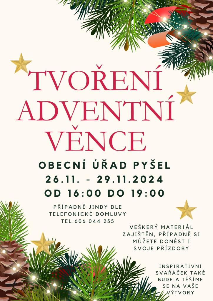 Přijďte si vytvořit svůj vlastní originální adventní věnec na obecní úřad v Pyšele od úterý 26.11. do pátku 29.11. vždy od 16:00 do 19:00. Máte připravené různé druhy chvojek, veškerý materiál, případně si klidně můžete donést i svoje přízdoby. Dáte si inspirativní svařáček a uvidíme, jaký věnec vykouzlíte.